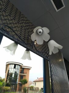 Specchio in ferro battuto, L.78 x H.78 cm, con faretti a fiore.
